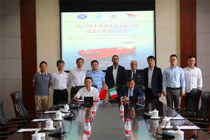 近日,武船集團海工院為意大利Marnavi船東打造的“14620DWT不銹鋼化學品船”在武船總部舉行了2#船建造合同簽約儀式。意大利船東代表、武船集團代表、海工院代表參加簽約儀式。