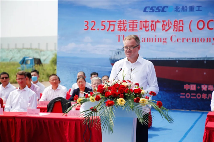 儀式現(xiàn)場由北船重工副總經(jīng)理鮑會勇主持命名暨交船儀式,北船重工總經(jīng)理谷克超、上海船舶研究設(shè)計院黨委書記王麟、中國船級社青島分社總經(jīng)理朱永實、勞氏船級社全球首席運營官Mark Darley、香港明華船務(wù)有限公司副總經(jīng)理李霖、工銀租賃航運金融事業(yè)部執(zhí)行總經(jīng)理郭芳萌先后致辭,工銀租賃項目與投資審批部副總經(jīng)理高潔將本船命名為“ORE CHONGQING”并為其砍纜。
