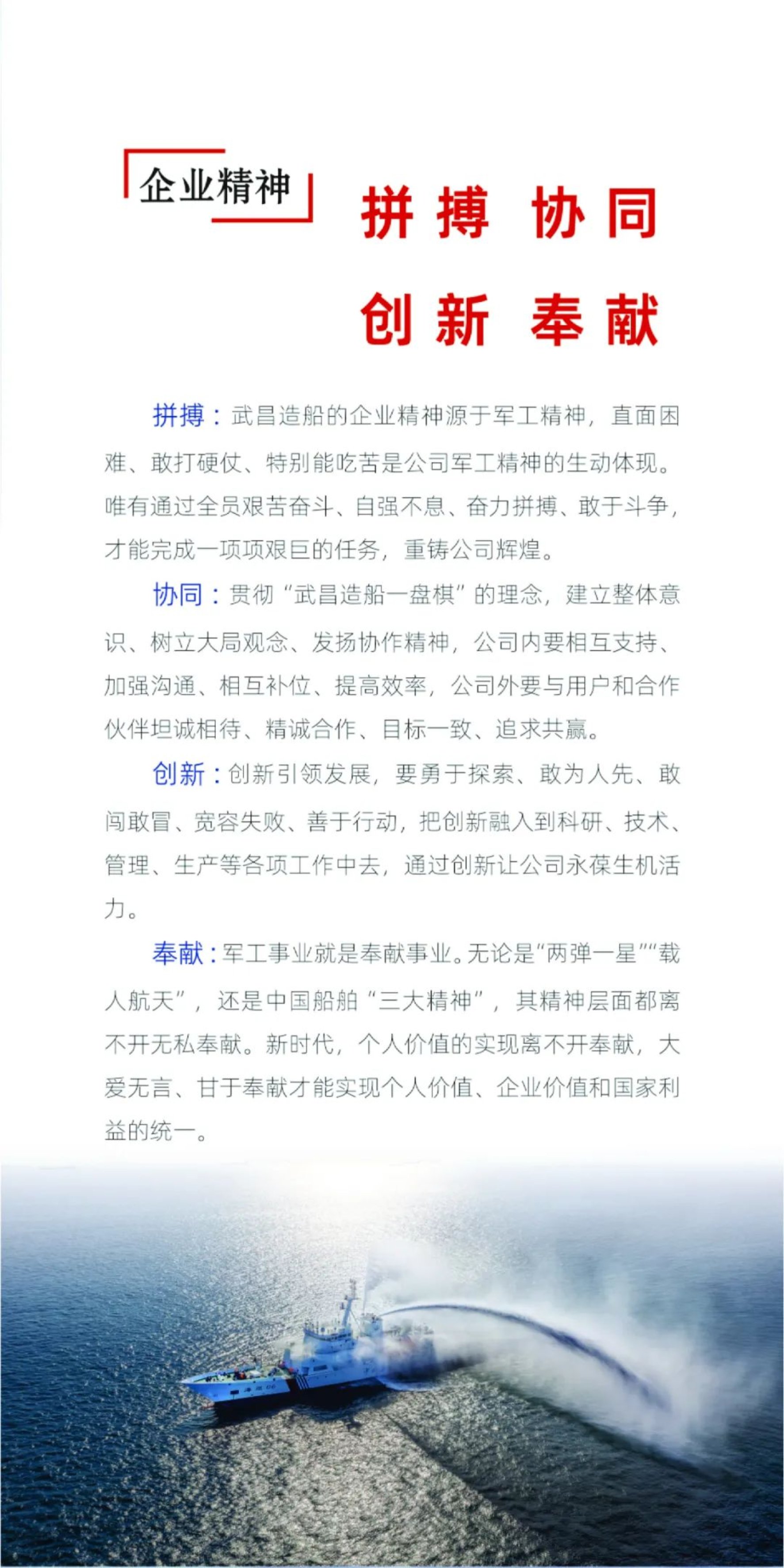 我們期望并相信,通過由里到外將企業(yè)文化核心理念融入管理,通過自上而下將企業(yè)文化核心理念深度踐行,將進(jìn)一步用武昌造船砥礪發(fā)展史啟迪武昌造船人,用武昌造船精神鼓舞武昌造船人,用武昌造船核心價(jià)值觀凝聚全體職工、客戶和社會(huì)各界朋友,推動(dòng)武昌造船持續(xù)健康發(fā)展、做強(qiáng)做優(yōu)做贏,實(shí)現(xiàn)高質(zhì)量發(fā)展,為集團(tuán)公司創(chuàng)建世界一流船舶集團(tuán)貢獻(xiàn)力量,為國(guó)家國(guó)防建設(shè)和地方經(jīng)濟(jì)發(fā)展做出更大貢獻(xiàn),與全體員工和社會(huì)各界共建共贏、共享高質(zhì)量發(fā)展成果。