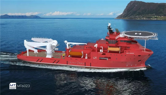 MT6023 深潛水工作支持船入DNV船級社,集飽和潛水支持、油田守護、浮油回收、ROV、DP2、FIFI2等功能于一體。船上將配備1臺150噸海工吊,具有升沉補償功能;1套18人飽和潛水系統,最大工作深度為300米;2套ROV裝備,可在3000米水深工作。