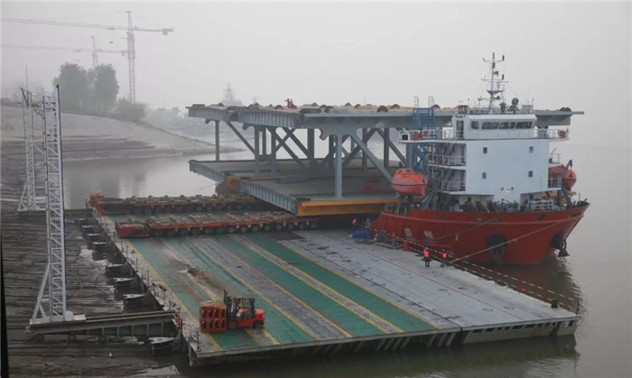 斜船架經(jīng)過45分鐘的下行,滑行到達指定水域,等待的運輸船舶盛暢7#迅速起錨靠近斜船架,固定纜繩、對準搭接通道、左舷壓水,項目部、起重運輸部和雙柳公司等20余人的發(fā)運團隊各就各位,各司其職,一系列的準備工作嫻熟而利落。隨后操作人員啟動模塊車,在指揮人員的指令中,緩緩上船。3排軸線上船后,船右舷傾斜下沉,對講機中不斷傳來操作指令:斜船架1檔下行、停止、左舷繼續(xù)壓水、模塊車低速前進……,模塊車前輪越過中線后,船體逐漸向左舷復位傾斜,對講機中操作指令又不斷清晰傳來:斜船架上拉、左舷壓水停止、模塊車繼續(xù)前進……。