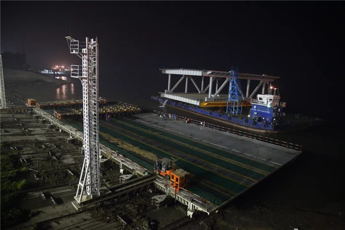 第22節(jié)G8H和第23節(jié)G9H分段接連裝船,分別裝上滬大禹7號和大禹傳奇兩艘運輸船舶。待大禹傳奇載著G9H分段離岸駛開時,夜幕再一次地來臨,時間指向21時。