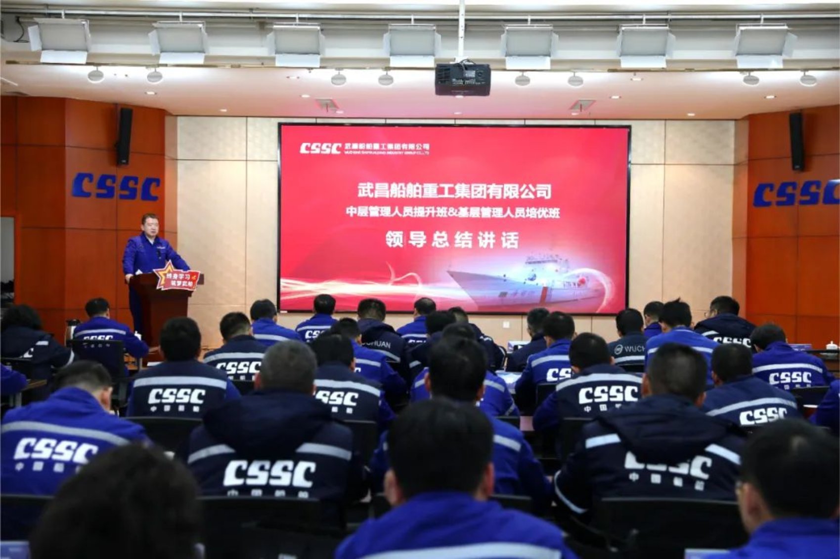 12月14日,中國船舶集團武昌造船首屆中層管理人員提升班、基層管理人員培優班結業典禮在創新樓12樓武船講堂順利舉行。公司黨委書記、董事長姜濤,黨委委員、副總經理田軍,黨委委員、副總經理、總工程師唐瀅出席結業儀式,培訓班全體學員參加結業典禮。