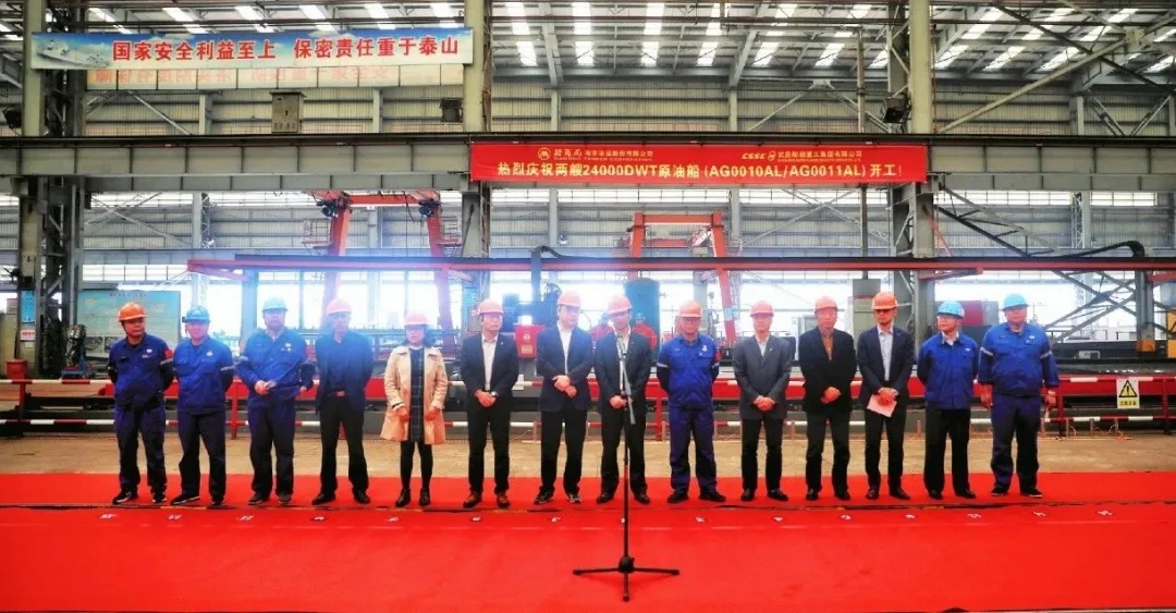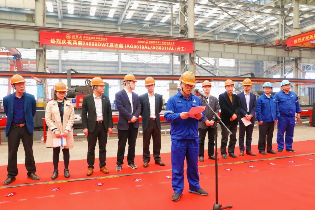 2020年10月30日10時18分,由中國船舶武船集團為招商局南京油運股份有限公司建造的兩艘24000DWT原油船在雙柳廠區順利開工。招商局南京油運股份有限公司總經理周斌、中國船級社武漢分社副總經理唐建、中國船舶及海洋工程設計研究院所長助理朱建璋、武昌船舶重工集團有限公司副總經理姚勝華等參加開工儀式。