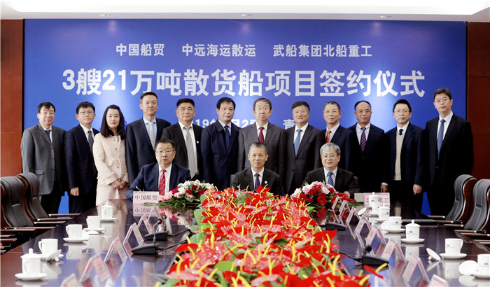 中遠海運散貨運輸有限公司副總經理黃志強、中國船舶重工國際貿易有限公司副總經理蔡洙一和武船集團北船重工黨委書記、董事長王國海代表三方在建造合同上簽字。