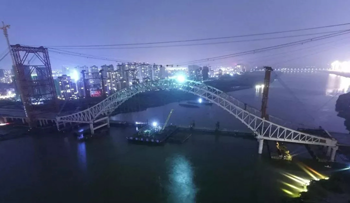 大橋主拱合龍后,橋面主梁運輸與架設施工將全面鋪開,預計今年8月30日實現橋面合龍。