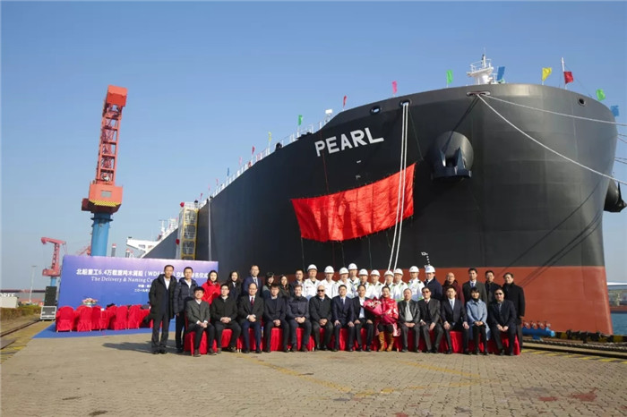 11月29日,武船集團北船重工6.4萬噸木屑船“PEARL”輪交船暨命名儀式在青島北船重工造船8號碼頭隆重舉行。