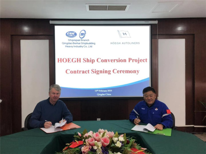 2月19日,武船集團北船重工副總經(jīng)理、修船分廠廠長劉玉東和挪威禮諾航運公司新造和改裝負(fù)責(zé)人JAN RUNE MORKEN先生在修船分廠簽署HOEGH 2019年改裝合同。這是北船重工今年首次簽署的改裝工程新訂單,為今年修船工作取得開門紅。